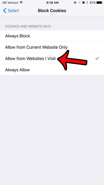Adım 4: Safari tarayıcınızın göz attığınız web sitelerinden çerezleri nasıl işlemesini istediğiniz için tercih edilen yöntemi seçin.