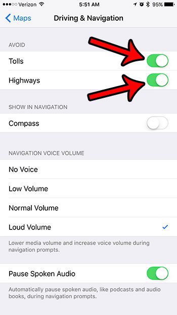 4. Adım: Sağdaki düğmelere dokununTollsVeKarayollarıonları açmak için. Düğmelerin etrafında yeşil gölgeleme olduğunda navigasyonda bu öğelerden kaçınılacaktır. Aşağıdaki resimde iPhone'daki haritalar uygulaması, gezinme talimatları verirken geçiş ücretlerinden ve otoyollardan kaçınacaktır.