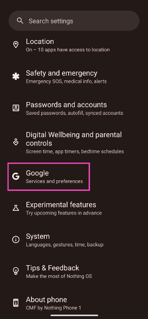 1. Adım:Gidip gelmekAyarlarve seçGoogle.
