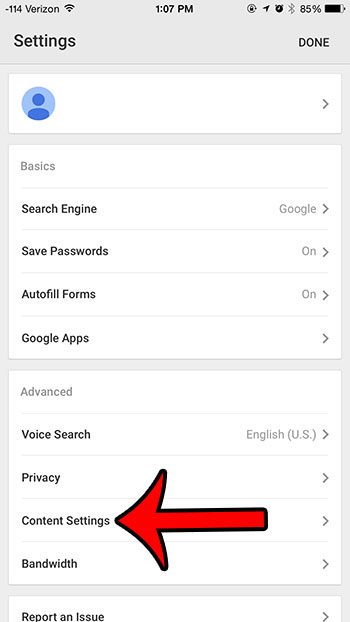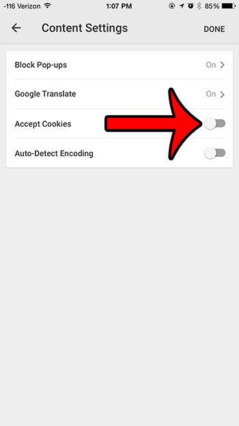Çoğu tarayıcı bu değişikliği yapmanıza izin verir ve iPhone'unuzdaki Chrome Tarayıcı uygulaması farklı değildir. İPhone'unuzdaki Chrome'daki çerezleri nasıl engelleyeceğinizi öğrenmek için aşağıdaki öğreticimizi okuyabilirsiniz.