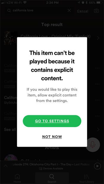 Şimdi açık içeriğe sahip bir şarkıyı denemeye çalıştığınızda, açık olarak etiketlenen herhangi bir şarkı arama sonuçlarında gri olacak. Gri bir şarkıya dokunmak bu pop-up'ı gündeme getirecek. Birisi dokunursaAyarlara GitDüğme, Spotify uygulamasının Ayarlar menüsüne götürülecek ve burada açık içeriği yeniden etkinleştirmek için bir parmak izi vermeleri gerekecek.