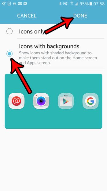 Adım 5: Solundaki daireye dokununArka planlı simgelerBu seçeneği seçmek için. Bu değişiklikle uygulama simgelerinizin nasıl göründüğüne dair bir örnek göreceksiniz. Daha sonra değişikliği uygulamak için ekranın sağ üst kısmındaki bitmiş düğmesine dokunabilirsiniz.