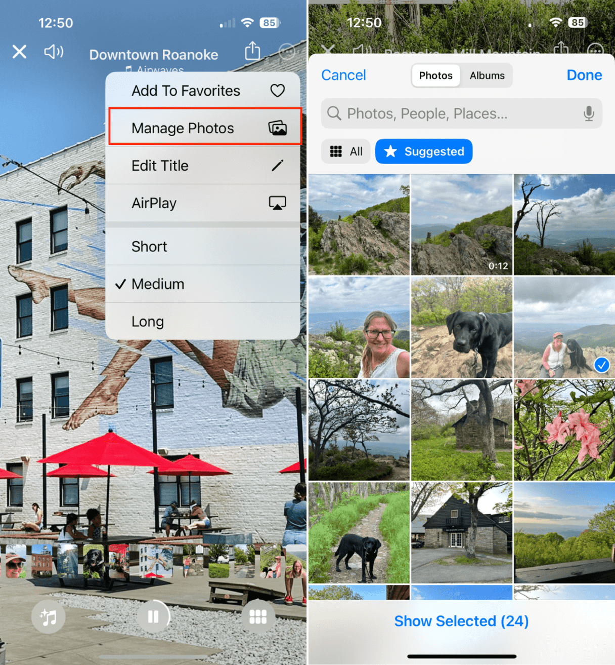 - Ardından, fotoğrafınızı bir bellek seçerek, üst RIGH'deki üç noktaya dokunarak ve 'Fotoğrafları Yönet' seçerek fotoğrafınızı fotoğraf uygulamasına ekleyin. Oradan, belleğe eklemek istediğiniz fotoğrafa dokunabilirsiniz.