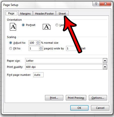 4. Adım: tıklayınÇarşafÜstündeki sekmeSayfa kurulumupencere.
