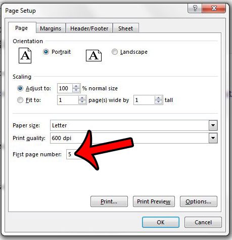 4. Adım: İçine tıklayınİlk sayfa numarasıPencerenin altındaki alan, ardından basılı e -tablonuzun ilk sayfasında sayfa numarası olarak görünmek istediğiniz numarayı girin. Sonra tıklayabilirsinizTAMAMDeğişikliklerinizi uygulamak için pencerenin altındaki düğme.
