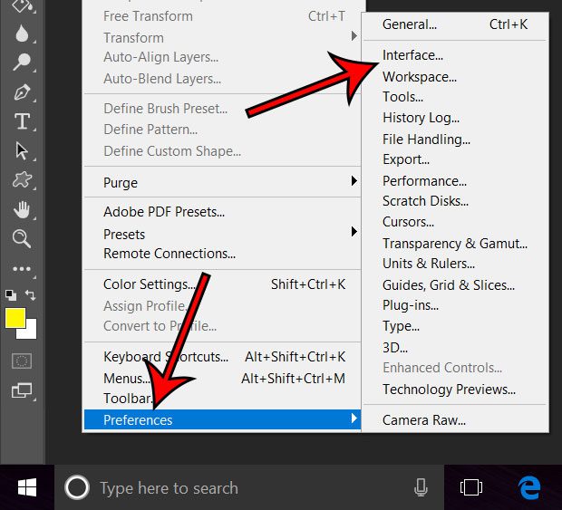 3. Adım: SeçinTercihlerMenünün altındaki seçenek, ardındanArayüzseçenek.