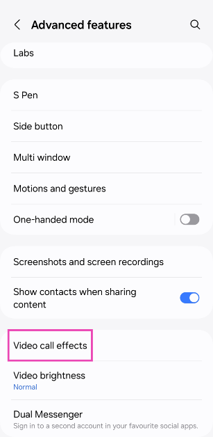 Bu özellik sadece Samsung'un One UI tarafından sunulmaktadır. Bu video çağrısı efektlerini kullanmak için Samsung akıllı telefonunuz, temel varyant değil, tam bir UI sürümünü çalıştırıyor olmalıdır. Bir UI çekirdeği Samsung'un bütçe tekliflerinde bir elyaftır. Video çağrısı efektleri, cihaz ayarlarındaki 'Gelişmiş Özellikler'den etkinleştirilebilir. Etkinleştirildikten sonra, tüm önemli iletişim uygulamalarını görüntülü çağırırken uygulanabilirler.