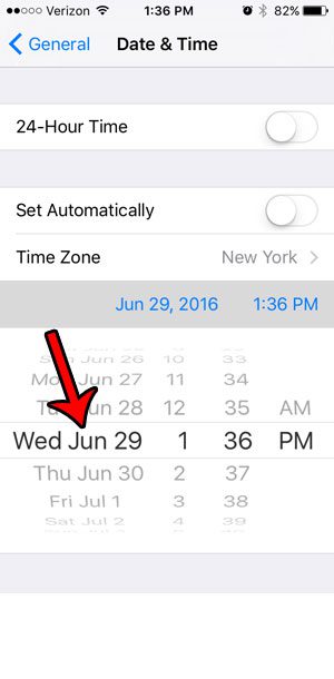 Adım 5: İPhone'unuzda kullanmak istediğiniz tarih ve saati seçmek için tekerlekleri kullanın. Sonra dokunabilirsinizGenelBu menüden çıkmak ve değişikliklerinizi uygulamak için ekranın sol üst kısmındaki düğme.
