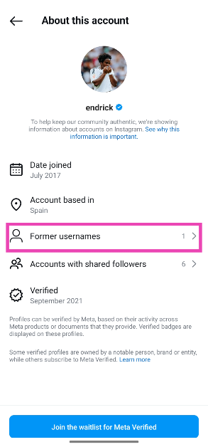 Kullanıcının profiline gidin, Ellips'e basın, 'Bu Hesap Hakkında' üzerine dokunun ve Instagram tutamaçlarını kaç kez değiştirdiklerini görmek için 'eski kullanıcı adlarını' seçin.