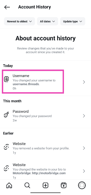 Instagram, kullanıcı adı geçmişinizi de görüntülemenizi sağlar. Bu seçenek, profil bölümünüzdeki 'Etkinliğiniz' bölümünde sıkışmıştır. Kamu hesaplarından farklı olarak, geçmiş kullanıcı adlarınızı ve ne zaman değiştirdiğinizi görüntüleyebilirsiniz. Benzer şekilde, şifrenizi değiştirdiğinizde önceki BIOS'unuzu ve tarihleri kontrol edebilirsiniz.