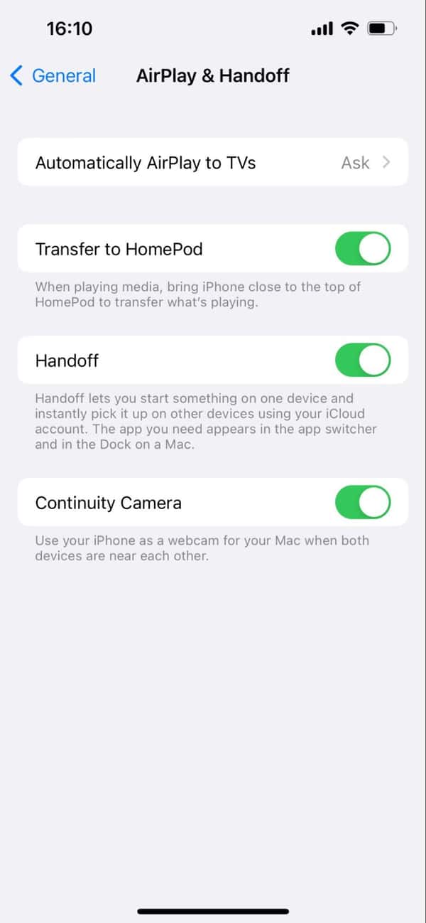 - Genel, ardından Airplay & Handoff'a dokunun.