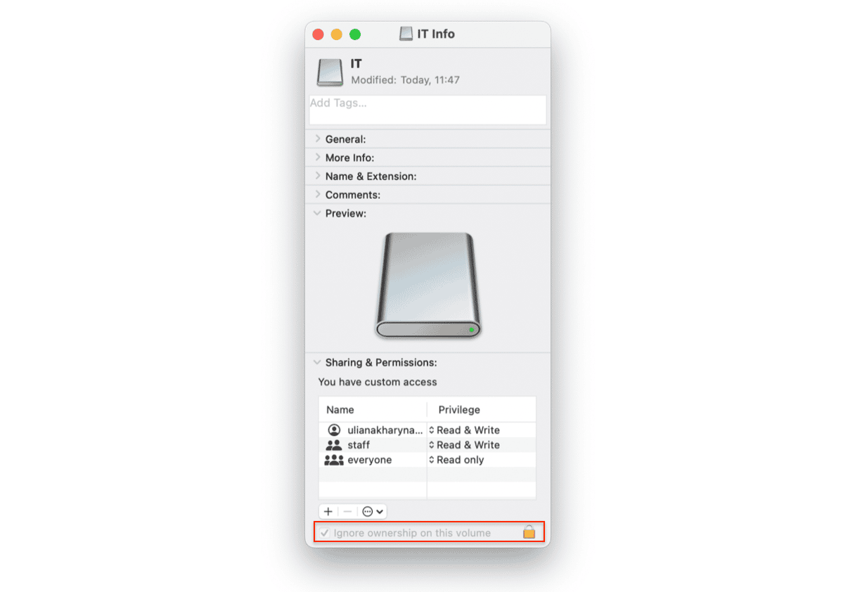 - “Bu ciltte sahipliği görmezden gelin” seçildiğinden emin olun. Değilse, asma kilit tıklayın, bir yönetici adı ve şifre yazın ve ardından kutuyu seçin.