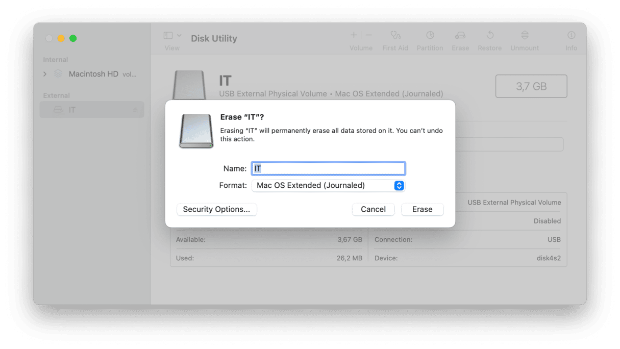 - Harici sürücünüzü seçin ve Mac'inize bağlayın. APFS veya macOS genişletilmiş (günlük olarak) olarak biçimlendirilmesi gerekir. Değilse, disk yardımcı programı (uygulamalar> yardımcı programlar> disk yardımcı programı) açın ve bu nedenle bu iki formattan biri olarak yeniden şekillendirir.