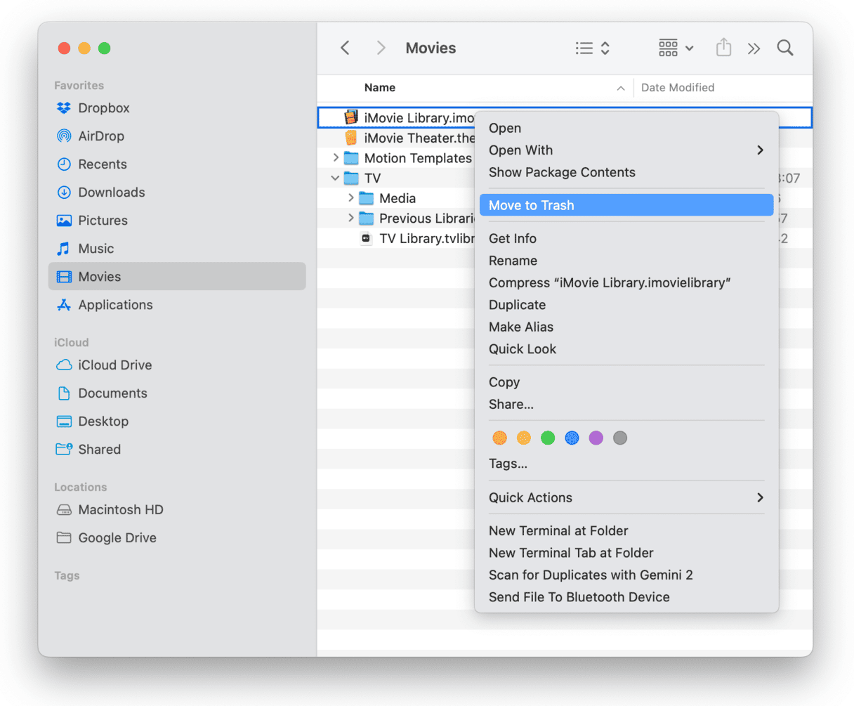 - Filmler klasörünüzden orijinal iMovie kütüphanesini çöp kutusuna gönderin ve boşaltın.