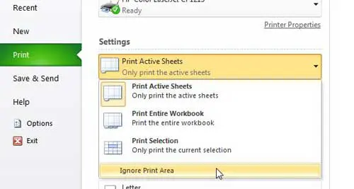 Bu ayarı tıklayarak bulabilirsiniz.DosyaSekme, tıklıyorBasılı, tıklamakEtkin sayfaları yazdırınaçılır menü, sonra seçiyorBaskı alanını görmezden gelin.