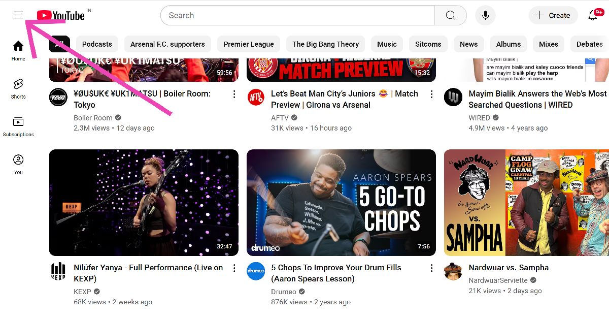 1. Adım:YouTube'a git ve vurHamburger menüsüekranın sol üst köşesinde.