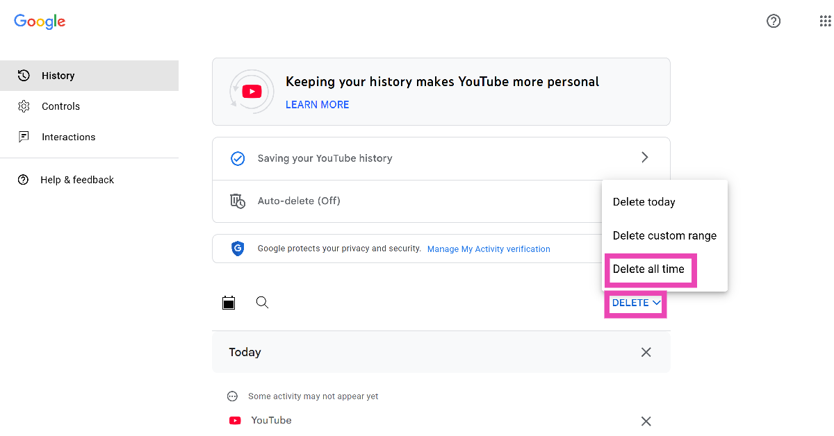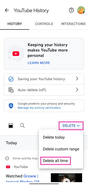YouTube uygulamasını başlatın,Siz> Ayarlar> Tüm geçmişi yönetin> Silve 'Her Zaman Sil' 'yi seçin.