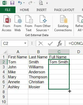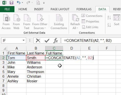 =CONCATENATE(XX, " ", YY)hücrenin içine. Yer değiştirmekXxilk adın hücre konumu ile ve değiştirinYYsoyadının hücre yeri ile. - BasmakGirmekFormülü tamamlamak için klavyenizde.