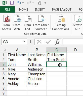 Ancak bazen bu orijinal sütunlardan Excel'de adı ve soyadı birleştirmeniz gerekecek ve bunu manuel olarak yapma olasılığı muhtemelen kaçınmak istediğiniz bir şeydir.