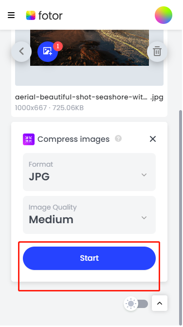 4. "Başlat" düğmesine tıklayın. Daha sonra Fotor, görüntülerinizi yüksek kalitede daha küçük bir dosya boyutuna otomatik olarak ve anında sıkıştırır.