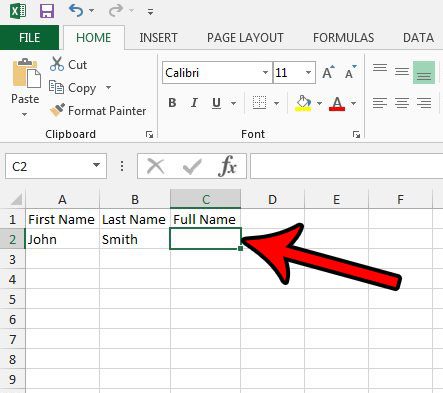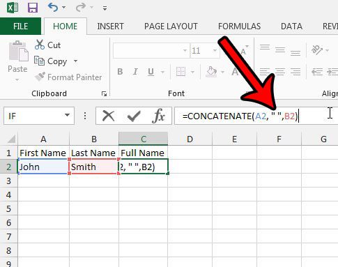 Excel'in bu hücrelerde tam olarak ne olduğunu birleştireceğini fark edebilirsiniz. Yukarıdaki örneğimde, bu formül Johnsmith ile sonuçlanacaktır. Ne yazık ki bu bunun istenen sonucu değil, bu yüzden formülde bir ayar yapmam gerekiyor. Formülü değiştirirsem=CONCATENATE(A2, " ", B2)Ardından istenen “John Smith” sonucunu gösterecektir. Bu formüldeki tırnak işaretleri arasında bir boşluk olduğunu unutmayın.