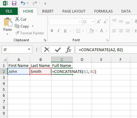 =CONCATENATE(A2, B2) | Johnsmith |