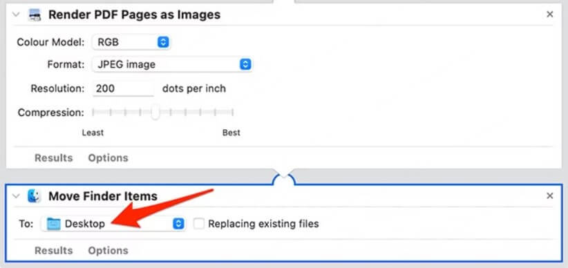 Adım 4 - Hedef seçin:"Bulucu öğelerini hareket ettirin”Dönüştürülen görüntülerin nereye kaydedileceğini belirtmek için eylem.