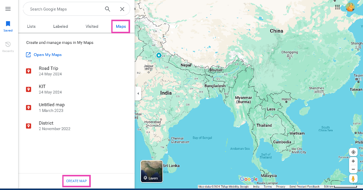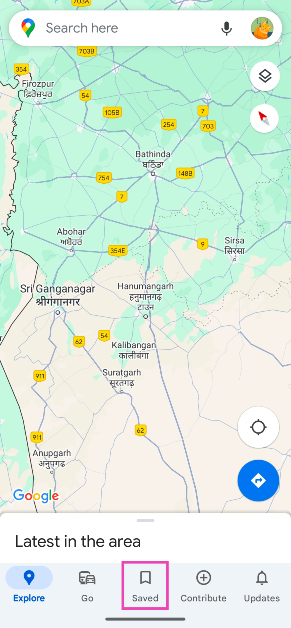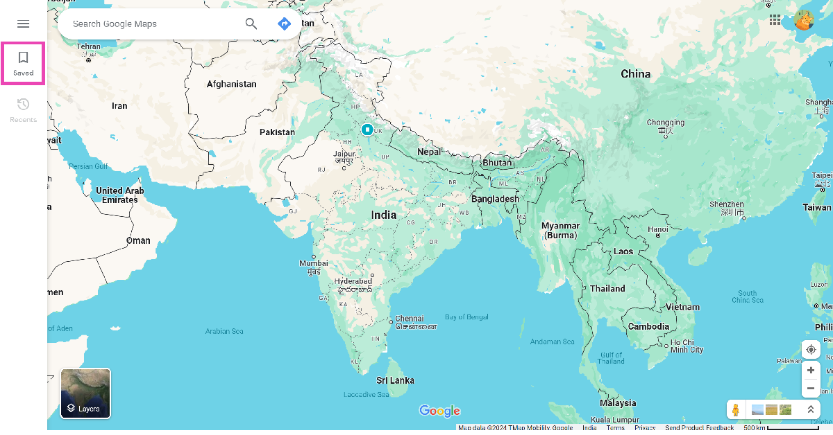 1. Adım:Google Haritalar'a gidin ve tıklayınKurtarılmışiçindekenar çubuğu.