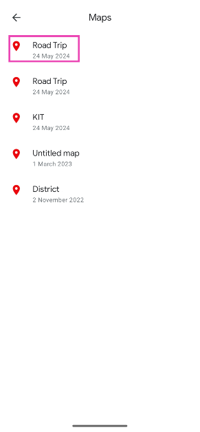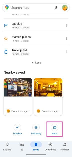 Google Haritalar uygulamasını başlatın, kaydedilen sekmeye gidin, haritalara dokunun ve ardından özel haritanızı seçin.
