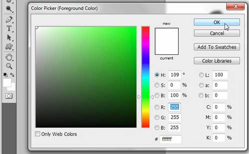 4. Adım: tıklayınÖn planPencerenin sol tarafındaki araç kutusundaki kutu, beyaz renk seçmek için renk seçicisinin sol üst köşesini tıklayın, ardından tıklayınTAMAMdüğme.