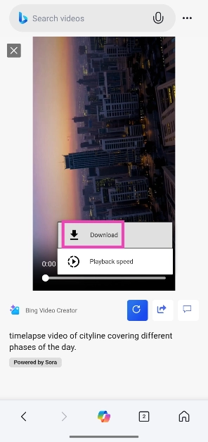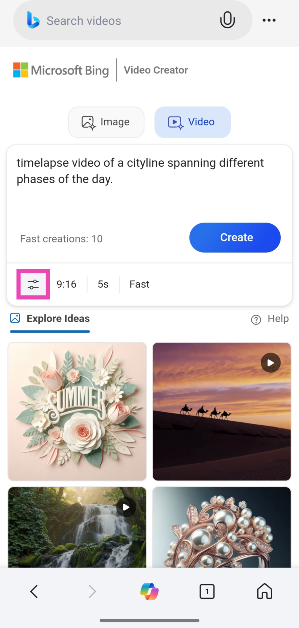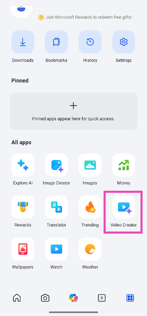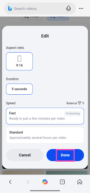 Bing uygulamasını telefonunuzda başlatın, menü simgesine dokunun ve 'Video Creator' seçeneğini seçin. Kutuya bir istemi girin. En boy oranını, süresini ve hızı seçin ve 'Oluştur'a basın.