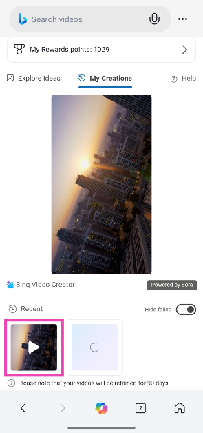 Sunulan 2 video üretim hızı vardır - standart ve hızlı. 'Standart' hızın bir video oluşturmak için birden fazla saat sürer. Uygulamayı en aza indirebilir ve AI hesaplamasının Bing'in sunucularını bitirmesini bekleyebilirsiniz. Videonuz bittikten sonra, Bing uygulaması size bir bildirim gönderecektir. 'Hızlı' seçeneği video üretimini birkaç dakika içinde bitirir. Ücretsiz 10 hızlı kreasyon elde edersiniz. Bunları kullandıktan sonra, hızlı bir oluşturma için 100 Microsoft Ödül Puanı takas edebilirsiniz. Bing AI kullanılarak oluşturulan videolar 90 gün boyunca hesabınızda saklanır. Videoları cihazınızdaki indirmeyi seçebilirsiniz.