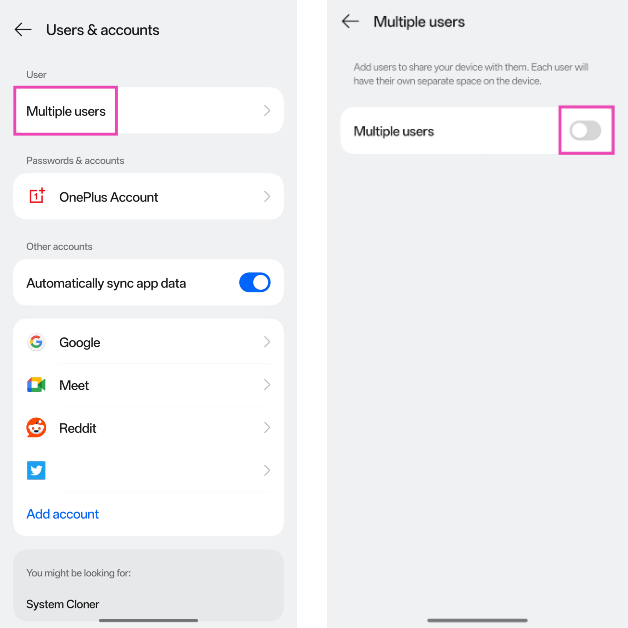 Android telefonunuzda farklı kullanıcılar için birden fazla profiliniz olabilir. Gidip gelmekAyarlar> Kullanıcılar ve Hesaplar> Birden çok kullanıcıonları kurmak için.