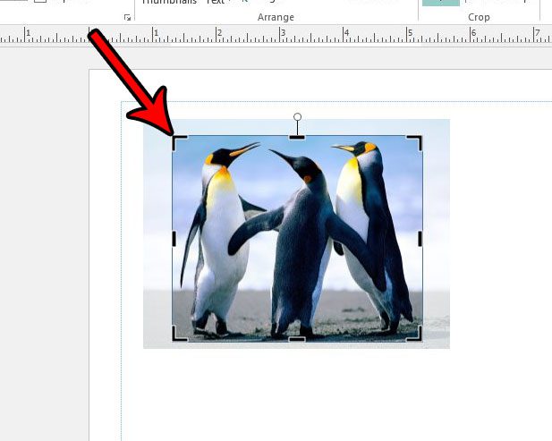 Adım 5: Resim üzerindeki siyah tutamaçlara tıklayın ve saklamak istediğiniz resmin kısmını çevreleyene kadar sürükleyin. Bitirdikten sonra, görüntünün seçimini kaldıracak belgenin başka bir bölümünü tıklayabilirsiniz. Daha sonra belgenizdeki resmin kırpılmış versiyonunu göreceksiniz.