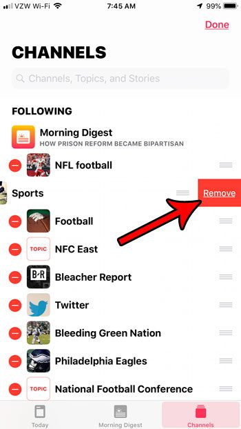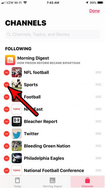 Bu makaledeki adımlar iOS 12.1'de bir iPhone 7 Plus'ta gerçekleştirildi. Bu kılavuzdaki adımları tamamlayarak, iPhone'unuzdaki varsayılan haber uygulamasında izlediğiniz kanallardan birini kaldıracaksınız. Gelecekte silinmiş bir kanalı tekrar takip etmek istediğinize karar verirseniz, kanalların her zaman daha sonra yeniden katılabileceğini unutmayın. Apple News'in bir parçası oldukları için artık ihtiyacınız olmayan başka haber uygulamalarını indirdiyseniz, bunları nasıl kaldıracağınızı görmek için iPhone 7 uygulamalarını silme kılavuzumuzu okuyabilirsiniz.