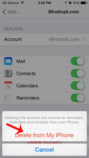 Adım 5: DokunİPhone'umdan silİPhone'unuzdan Hotmail hesabını silmek istediğinizi onaylamak için düğme.