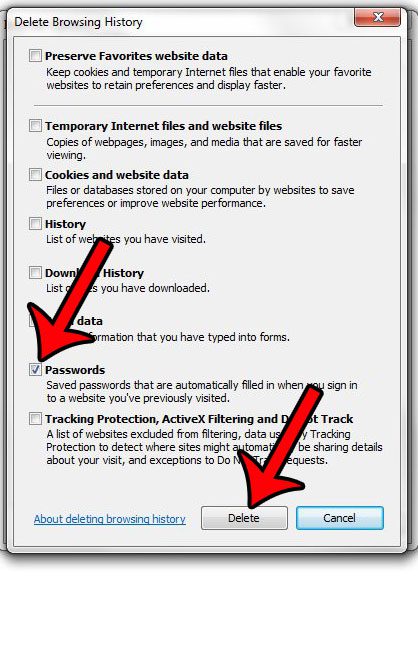 - Adım 5: Solundaki kutuyu kontrol edinŞifrelersonra tıklayınSilmekPencerenin altındaki düğme. Geçmişinizden de silmek istediğiniz başka veri türleri varsa, bu seçenekleri de kontrol edebilirsiniz.
