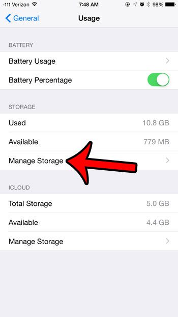 4. Adım: dokununDepolamayı YönetinDepolama bölümü altında seçenek.