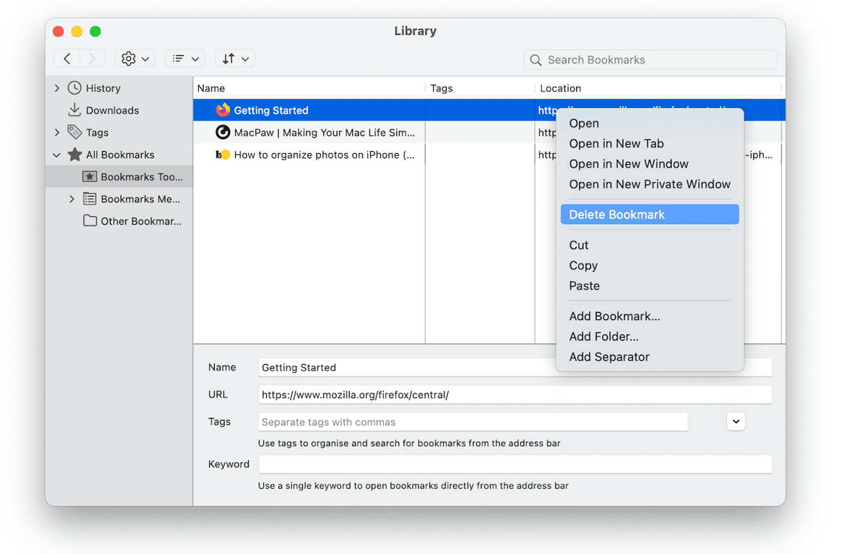 - Silmek istediğiniz yer işaretlerini seçin ve sağ tıklayın ve Sil'yi seçin veya Sil tuşuna basın.