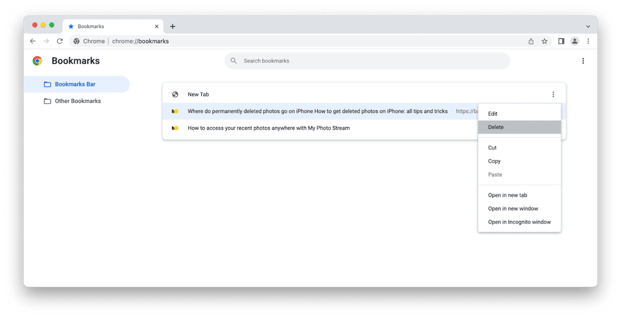 Safari'de olduğu gibi, bu tarayıcıdaki yer işaretlerini ayrı ayrı veya gruplar halinde silebilirsiniz. Mac'teki Chrome'da yer işaretlerini nasıl sileceğiniz aşağıda açıklanmıştır: