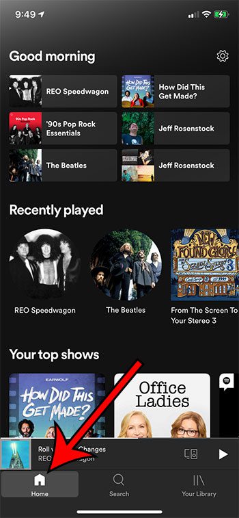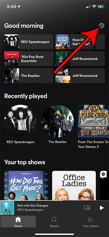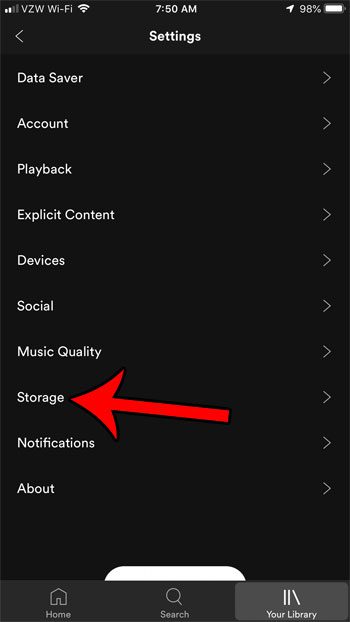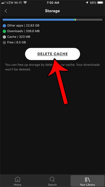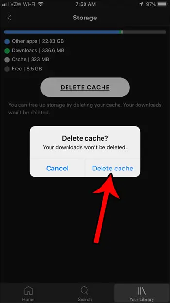 Spotify önbelleğinizi bir iPhone'dan açarak temizleyebilirsiniz.Spotify, seçmekEvSekme, dişli simgesine dokunarak, seçimDepolamak, dokunmaÖnbelleği Sil, ve daha sonraÖnbelleği SilTekrar.
