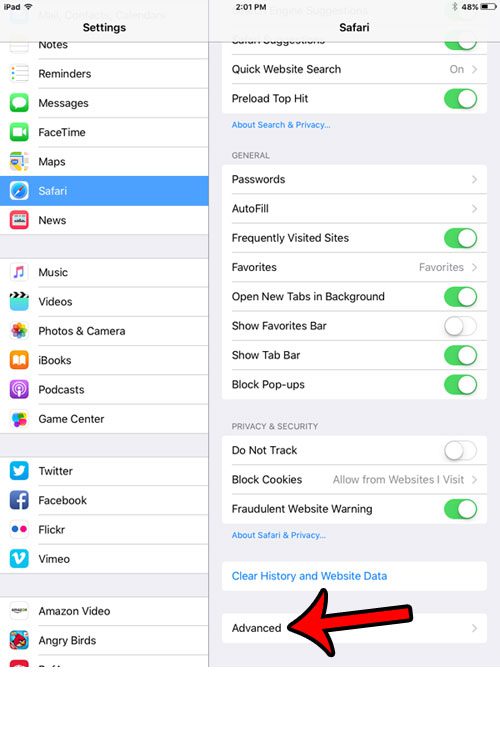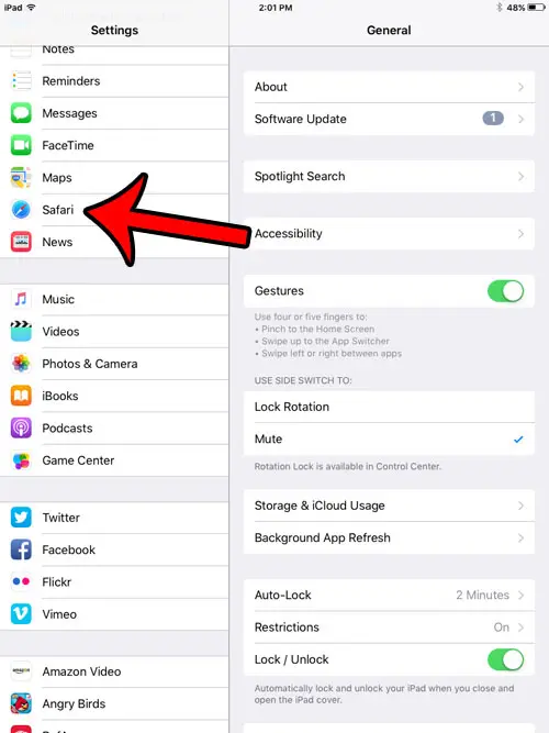 2. Adım: Aşağı kaydırın veSafariEkranın sol tarafındaki sütundan seçenek.