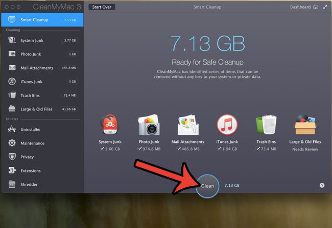 3. Adım: tıklayınTemizdüğme. Programın bazı dosyaları silme izni vermek için MacBook şifrenizi girmeniz gerekebilir. Ayrıca bazı açık programlardan çıkmanız gerekebilir. Bu gerekirse bunu yapmanız istenecektir.