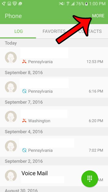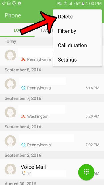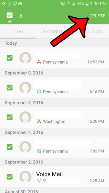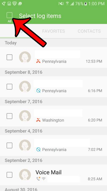 4. Adım: Kelimenin üzerindeki yeşil kutuya dokununTümekranın sol üst köşesinde. Bu, bu ekrandaki tüm çağrıları seçecektir. Sadece bazı çağrıları silmeyi tercih ederseniz, bunun yerine bu çağrıların her birini manuel olarak seçin.