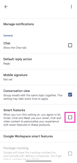 Gmail uygulamasını telefonunuzda başlatın, ayarlara gidin, bir hesap seçin ve aşağı kaydırın ve 'Akıllı Özellikler'in yanındaki kutuyu işaretleyin.