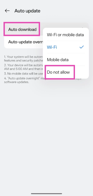 Gidip gelmekAyarlar> Sistem ve Güncelleme> Yazılım Güncellemesi, Elipses'e dokunun, 'Otomatik Güncelleme' seçeneğini seçin, 'Otomatik İndir' ve 'İzin Vermeyin' seçeneğine dokunun.