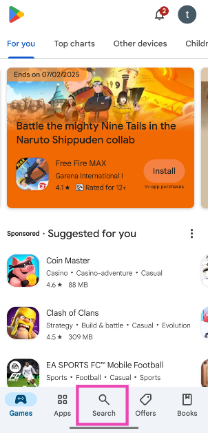 1. Adım: Öğle yemeğiTelefonunuzdaki Google Play Store uygulaması veAramaksekme.