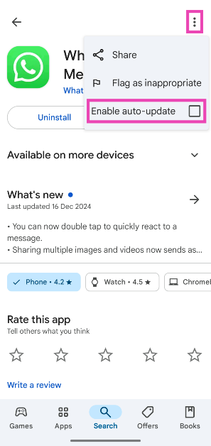 Belirli bir uygulama için otomatik güncellemeleri devre dışı bırakmak istiyorsanız (bu durumda, WhatsApp), Play Store'daki sayfasını açmak, Ellips'e basın ve 'Otomatik Updates'i Etkinleştir'in yanındaki kutuyu işaretleyin.