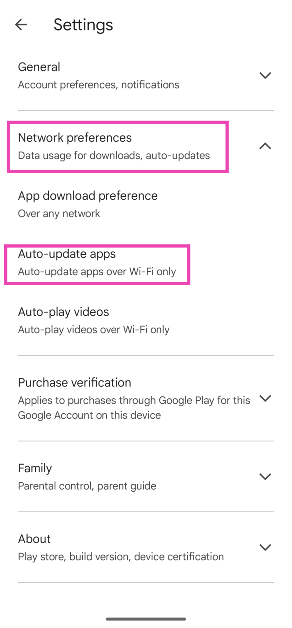 Google Play Store'a gidin, profil resminize dokunun, gidinAyarlar> Ağ Tercihleri> Otomatik Update Uygulamalarıve 'Uygulamaları otomatik olarak kullanmayın' seçeneğini seçin.