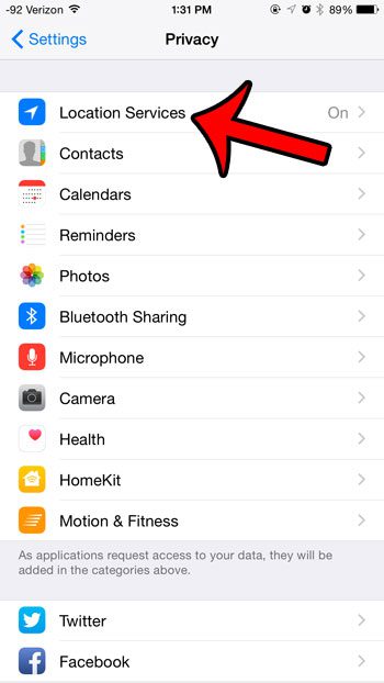 3. Adım: dokununKonum Hizmetleridüğme. ICloud menüsünden geçmeyi seçtiyseniz, menünün altına kaydırmanız veKonumumu paylaşBunun yerine seçenek (Adım 4'ü de atlayabilirsiniz).